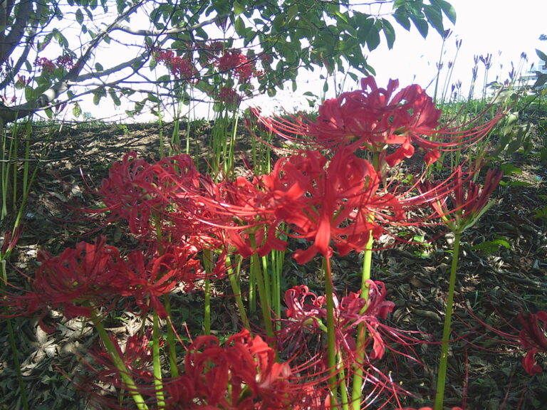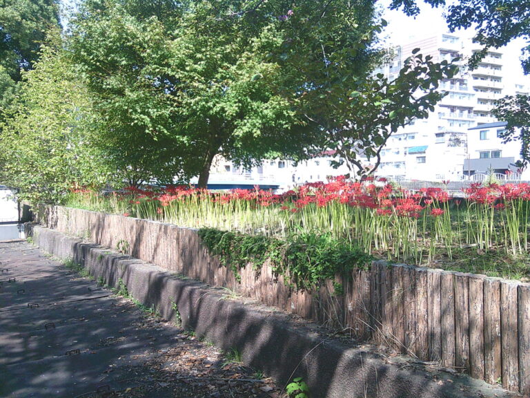 写真は北園テニスコート東側の流れ沿いのヒガンバナです。