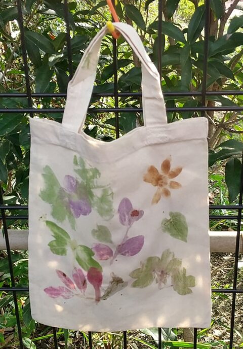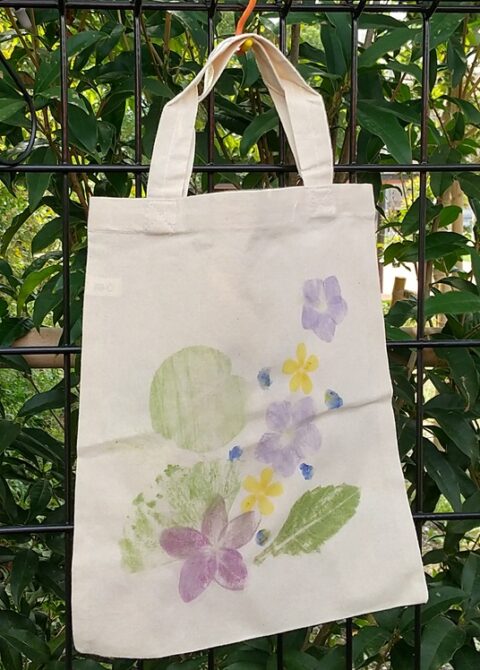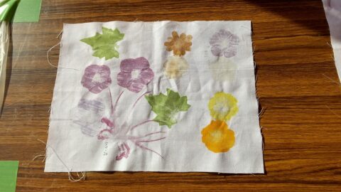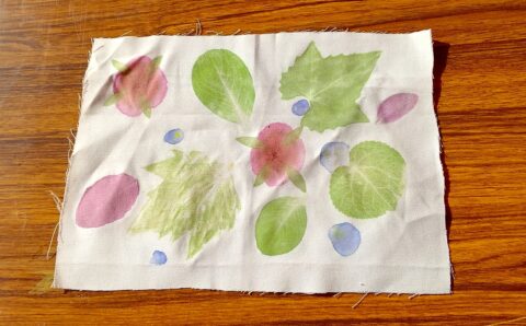 『たたき染め』とは、草木の葉や花を布に押し当て、叩いたりこすったりして色をうつして染める手法です。