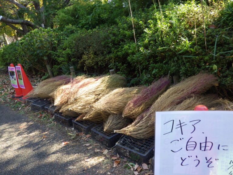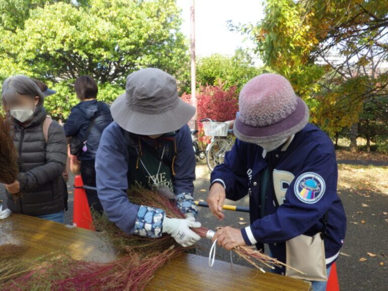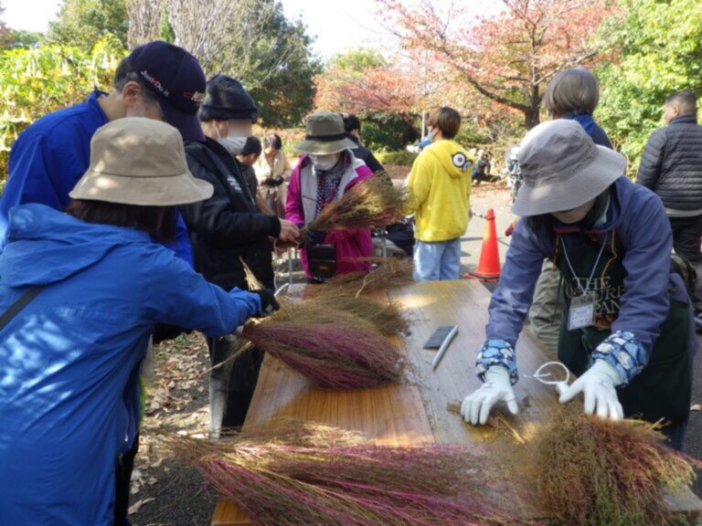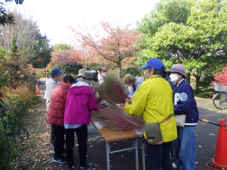 11月16日(日)の午前中に、自由の広場の大花壇前で「コキアのホウキ作り」を開催しました。