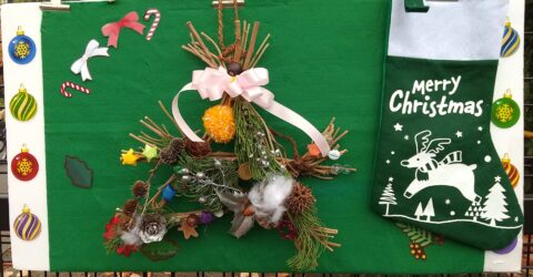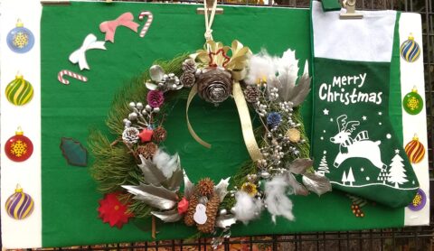材料には、どんぐりやまつぼっくりなどに加え、ヒイラギのような尖った葉をクリスマスらしく銀色に塗ったものなども用意されていたりしました。