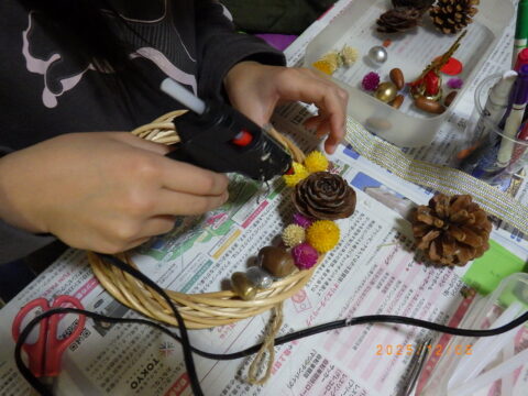 それぞれお好きな材料を、配置を考えながら、リースに付けていきます。