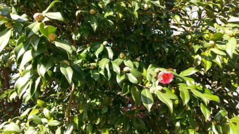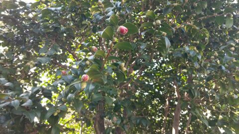 - サザンカ島の向かいの大きな笑顔の木も、花が増えてきました