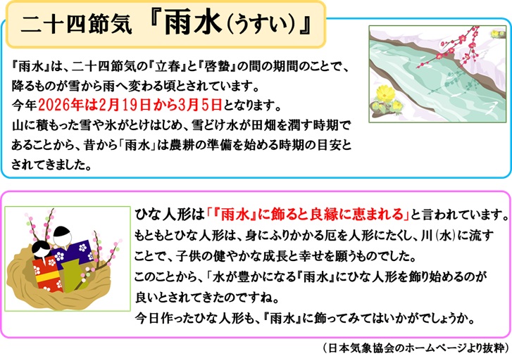 また今回は、ひな祭りに縁の深い二十四節気の『雨水』についてのご紹介も行いました。
