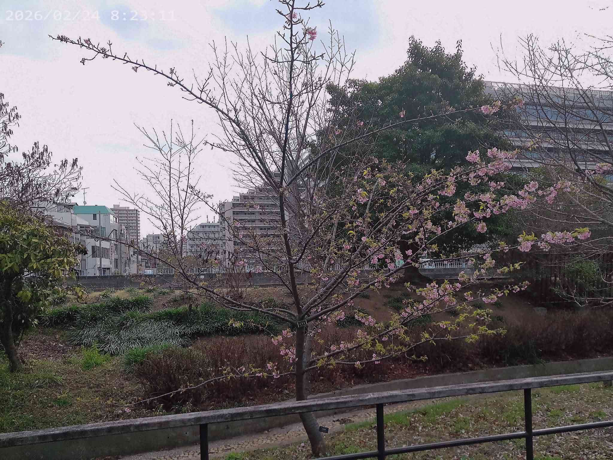 北園横十間川沿いに1本だけある河津桜が見ごろを迎えます。