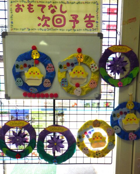 4月のイースターにあわせてひよこちゃんのエッグリース壁掛けや5月ごろに咲くクレマチスの壁掛けリースを作ってみました。