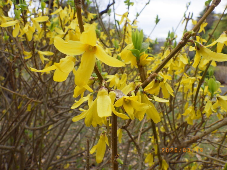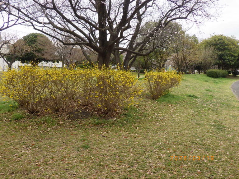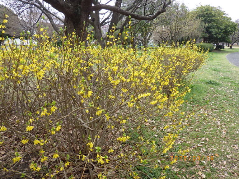 中川公園 B地区ふれあい広場南側のレンギョウの花が見頃を迎えています。