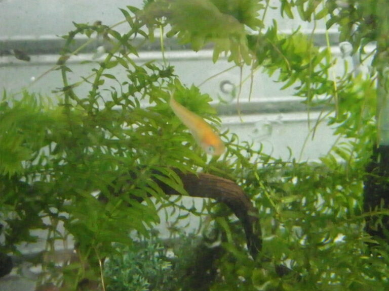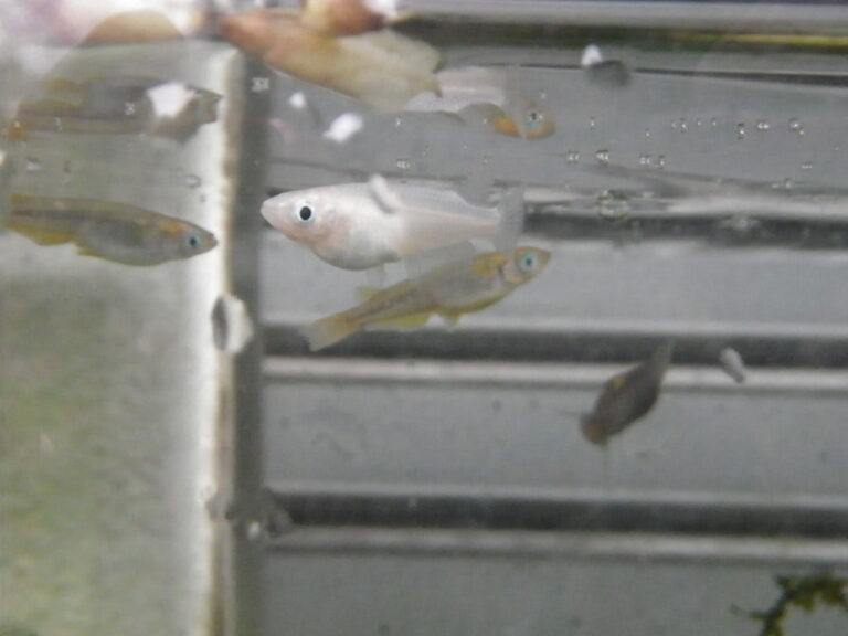 その中に6匹のメダカがいますが、その中に1匹の白いメダカがいます。