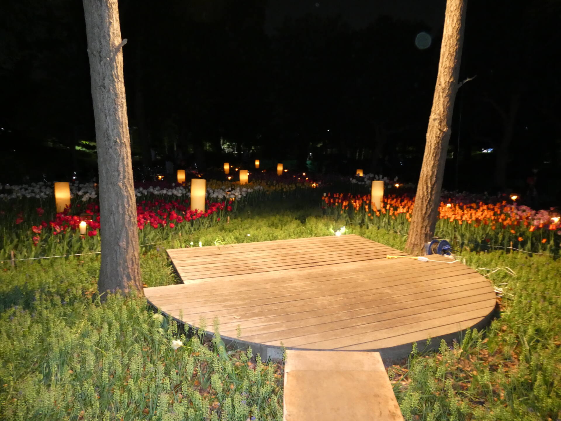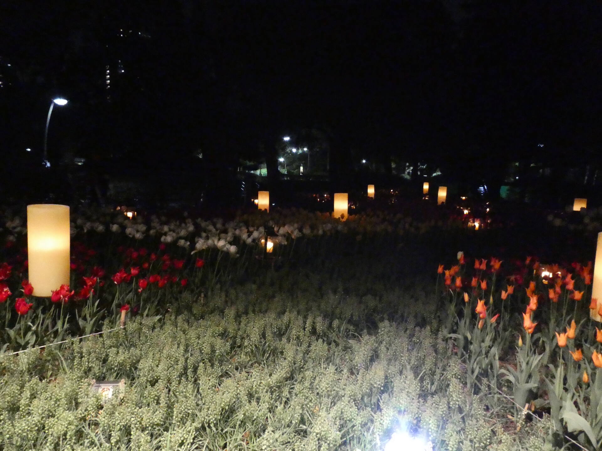 夜、キャンドルとランタンに火が灯った様子です。