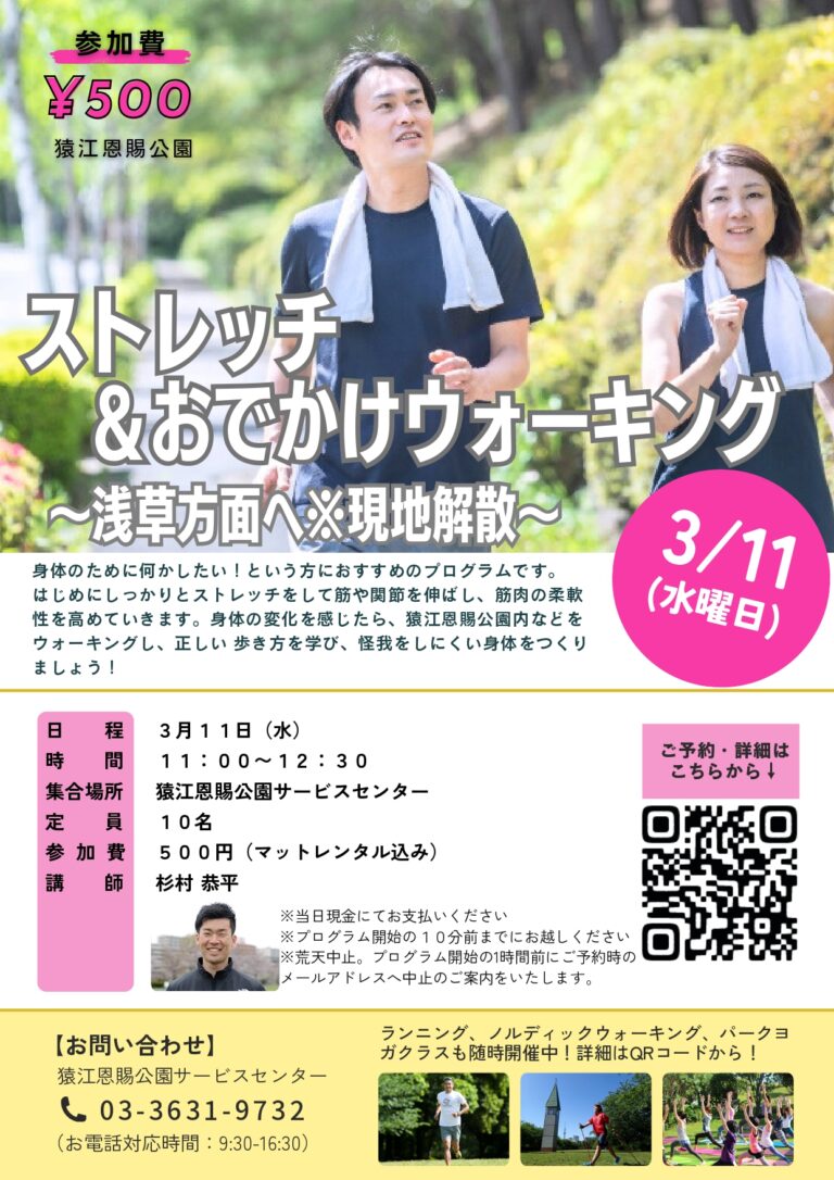 「ストレッチ&おでかけウォーク~浅草方面※現地解散~(猿江恩賜公園)」開催のお知らせ