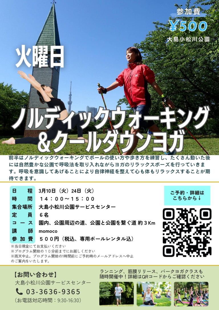 「ノルディックウォーキング&クールダウンヨガ~亀戸中央公園方面※現地解散~(大島小松川公園)」開催のお知らせ
