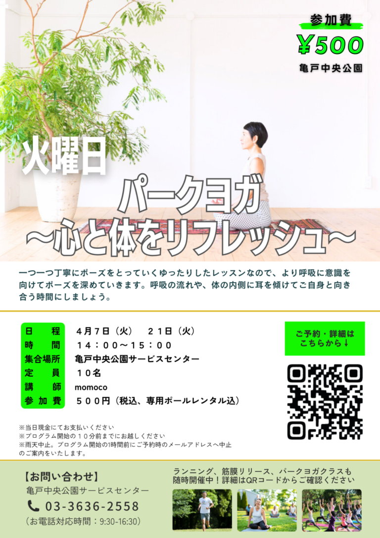 「パークヨガ~心と体をリフレッシュ~ (亀戸中央公園)」開催のお知らせ