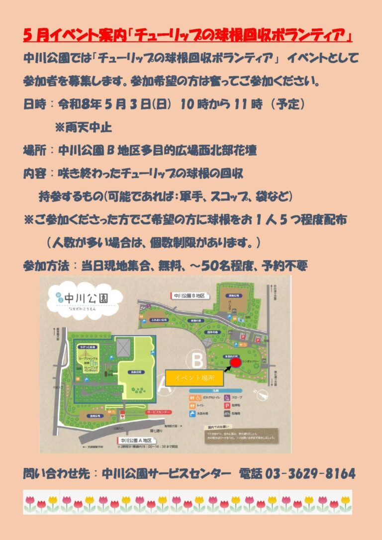 中川公園では「チューリップの球根回収ボランティア」 イベントとして参加者を募集します。
