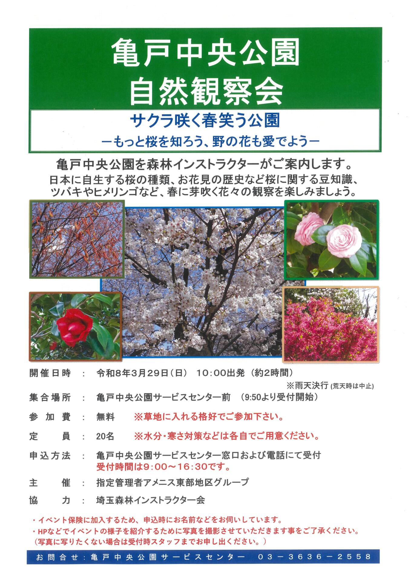 【亀戸中央公園】3/29(日)「自然観察会~サクラ咲く春笑う公園~」を開催します!