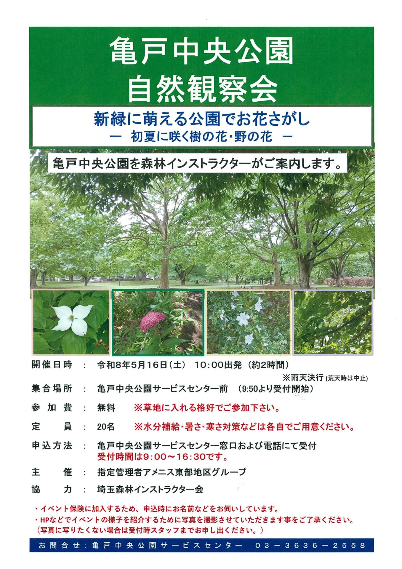【亀戸中央公園】5/16(土)「自然観察会~新緑に萌える公園でお花探し~」を開催します!