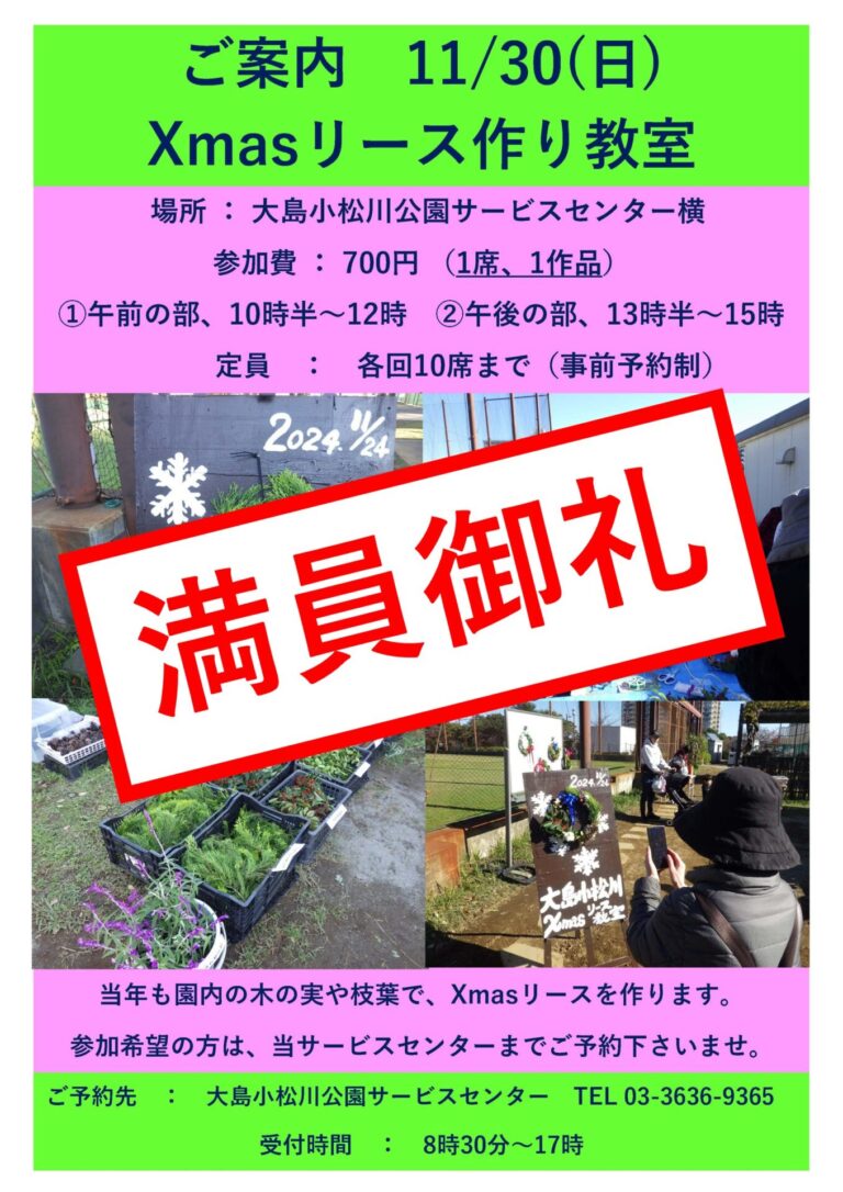 ※満員御礼【大島小松川公園】11/30(日)「Xmasリース作り教室」を開催いたします!