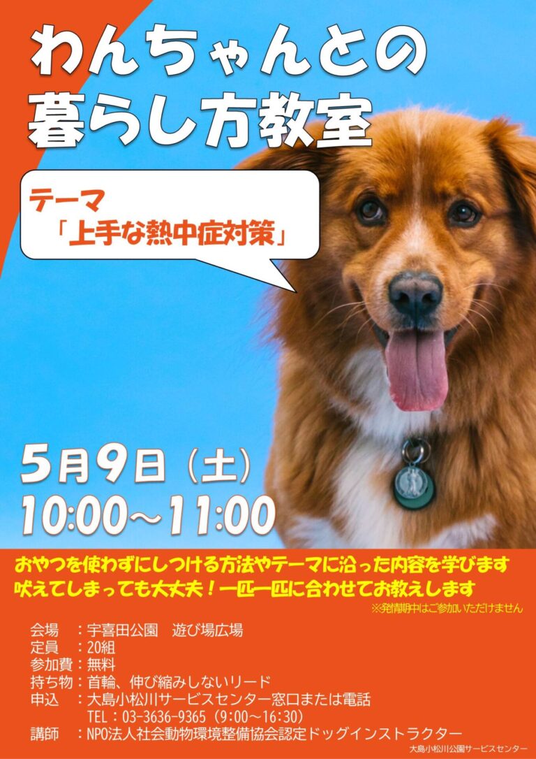 【宇喜田公園】5/9(土)わんちゃんとの暮らし方教室「上手な熱中症対策」を開催します!