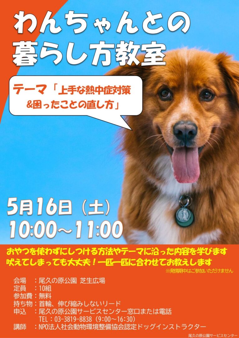 【尾久の原公園】5/16(土)わんちゃんとの暮らし方教室「上手な熱中症対策&困ったことの直し方」を開催します!