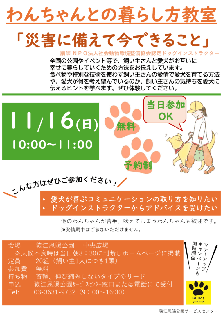 【猿江恩賜公園】11/16(日)わんちゃんとの暮らし方教室「災害に備えて今できること」を開催します!