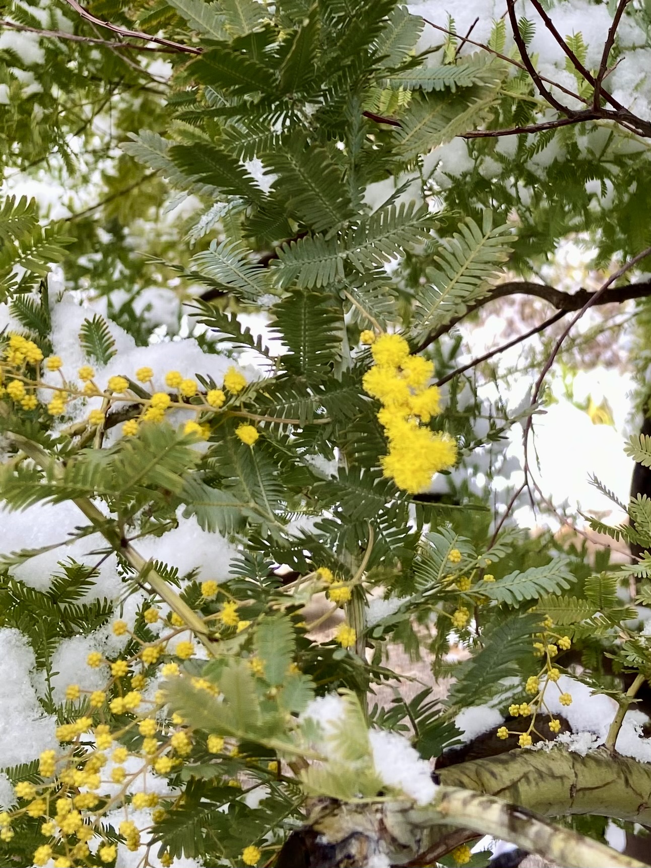 雪が積もった内側で可愛いミモザが咲いていました💛今年は咲くのが早いです!