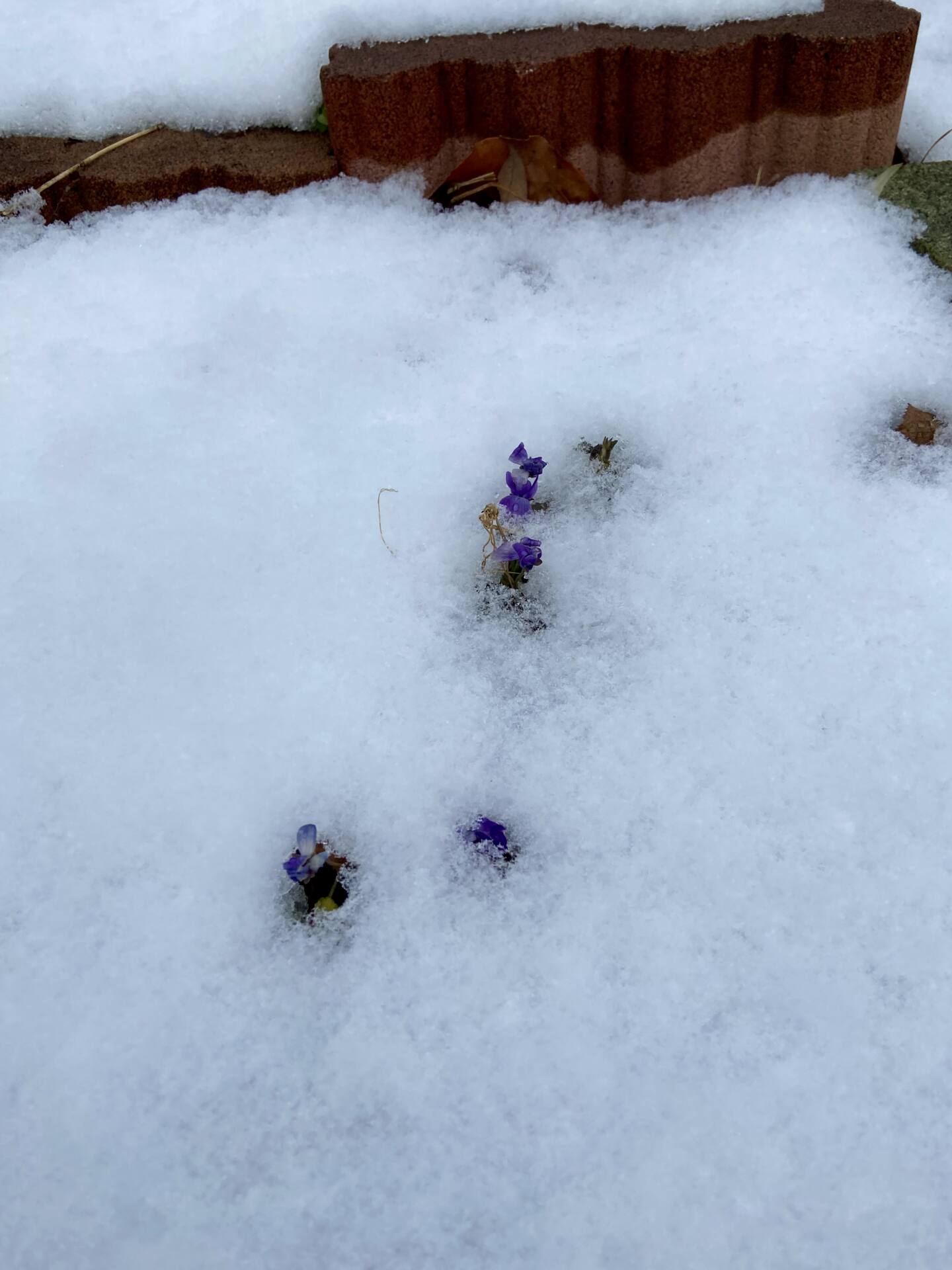 真っ白に積もった雪の中でも、可憐なニオイスミレが元気に咲いていました💜