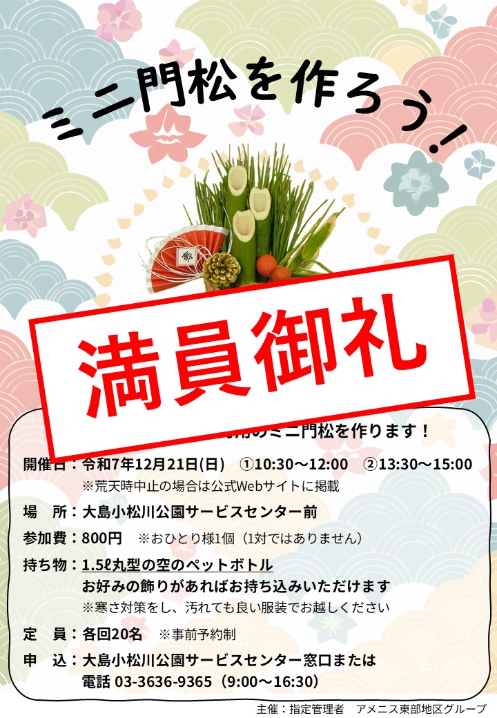 12月21日(日)に開催予定の「ミニ門松を作ろう!」はご好評により満員になりましたので、予約受付を終了いたします。