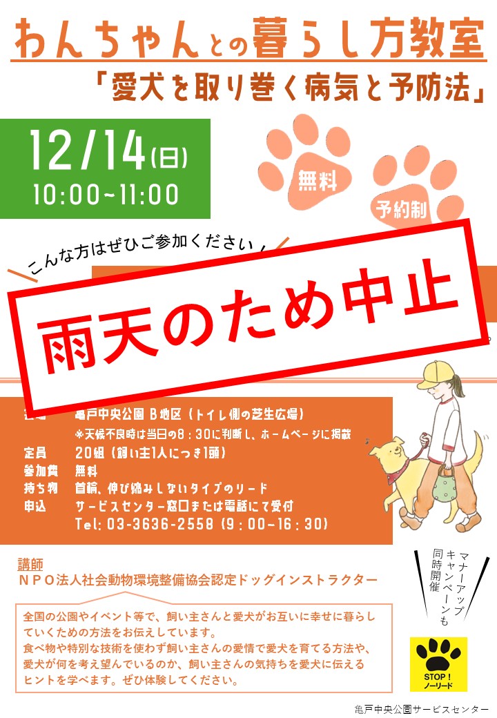 12月14日(日)に亀戸中央公園で予定されていた「わんちゃんとの暮らし方教室」ですが、雨天予報のため開催中止とさせていただきます。