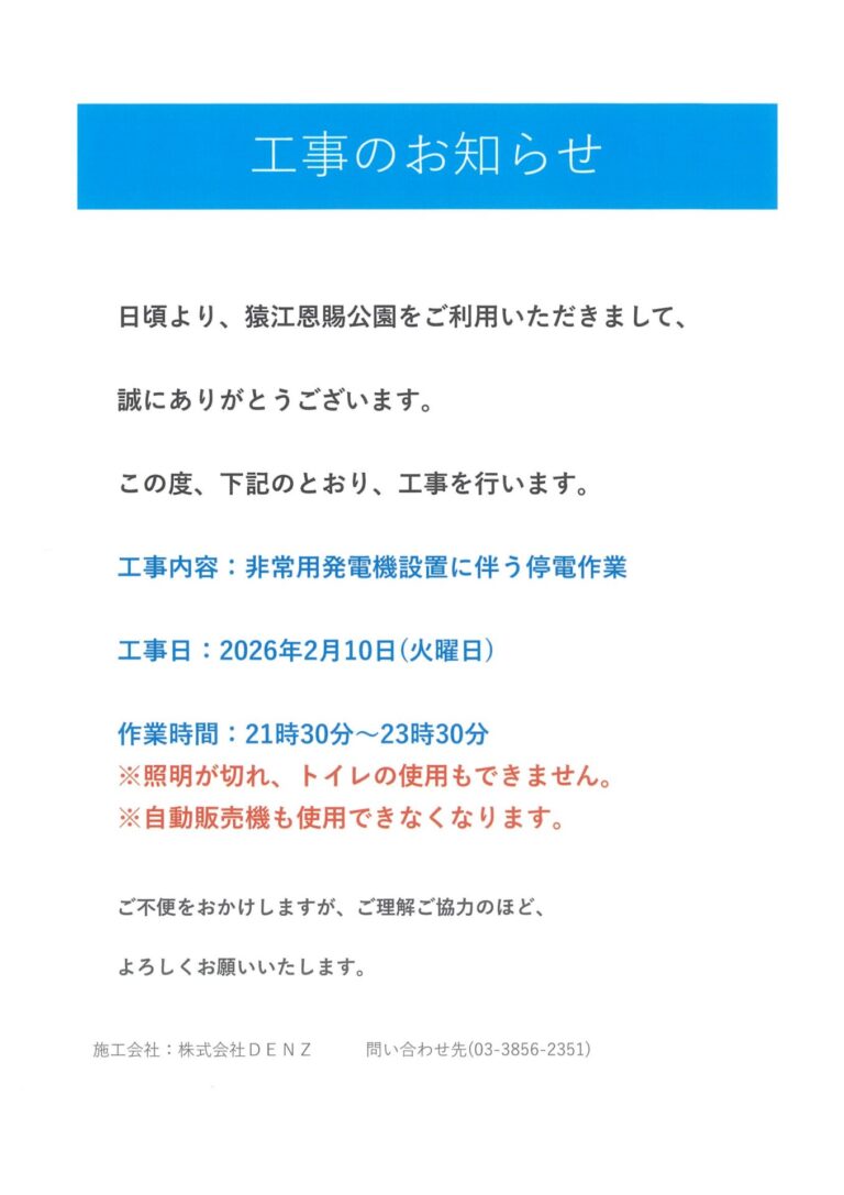 この度、園内において非常用発電機設置に伴う停電作業を行います。