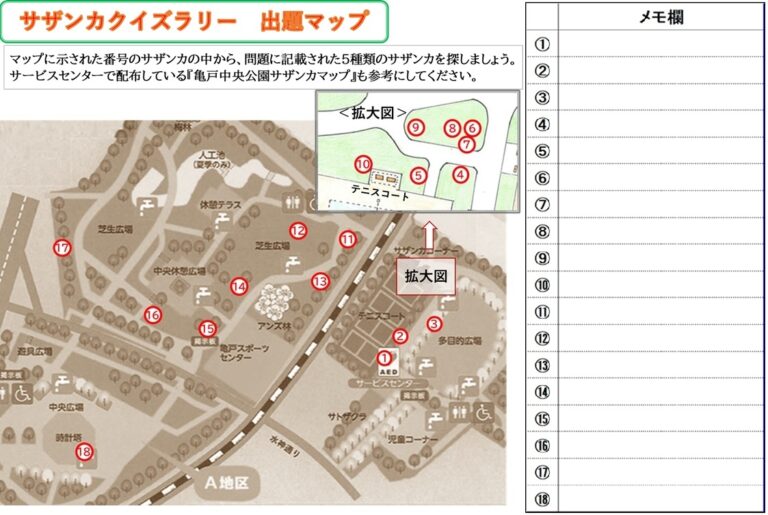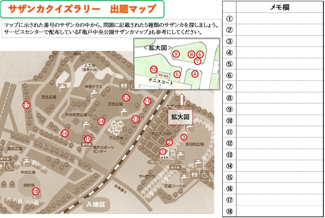 亀戸中央公園のサザンカに親しんでいただく企画として、昨年ご好評をいただいたクイズラリーを